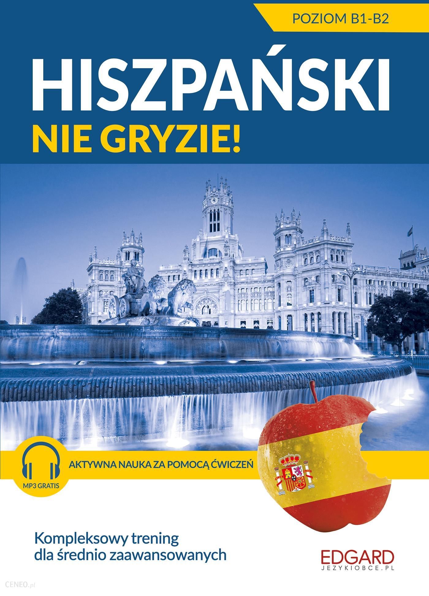 Unikalny kurs do samodzielnej, aktywnej nauki języka hiszpańskiego dla wszystkich, którzy chcą rozwinąć znajomość języka na poziomie średnio zaawansowanym (B1-B2). Książka opiera się na unikalnej metodzie aktywnej nauki, która dzięki licznym ćwiczeniom trenuje wszystkie kompetencje językowe: znajomość słownictwa (także potocznego), trudniejszych konstrukcji gramatycznych oraz czytanie i rozumienie ze słuchu. W 14 rozdziałach tematycznych znajdziesz ciekawe teksty, przystępnie wyjaśnioną gramatykę, dialogi i scenki sytuacyjne, porcję słówek, liczne ćwiczenia leksykalne i gramatyczne, a także interesujące informacje o Hiszpanii. Na końcu każdego rozdziału umieszczono praktyczny słowniczek. Książkę zamyka dodatkowy rozdział podsumowujący z 14 tekstami, poświęcony w szczególności rozwijaniu umiejętności rozumienia tekstu czytanego i rozumienia ze słuchu. Dołączone do kursu nagrania MP3 wykonane są przez profesjonalnych lektorów. Zawierają teksty otwierające każdy z rozdziałów, ciekawostki o Hiszpanii oraz wszystkie teksty z rozdziału podsumowującego. Kontynuacja bestsellera Hiszpański nie gryzie poznajesz niezbędne słownictwo trenujesz znajomość gramatyki rozwiązujesz różnorodne ćwiczenia doskonalisz rozumienie ze słuchu uczysz się konstruować wypowiedzi pisemne